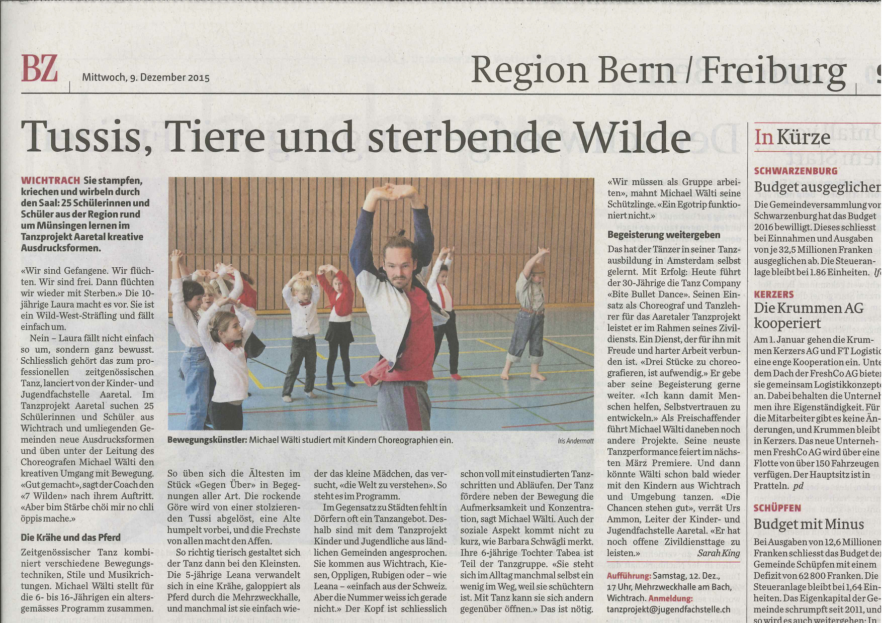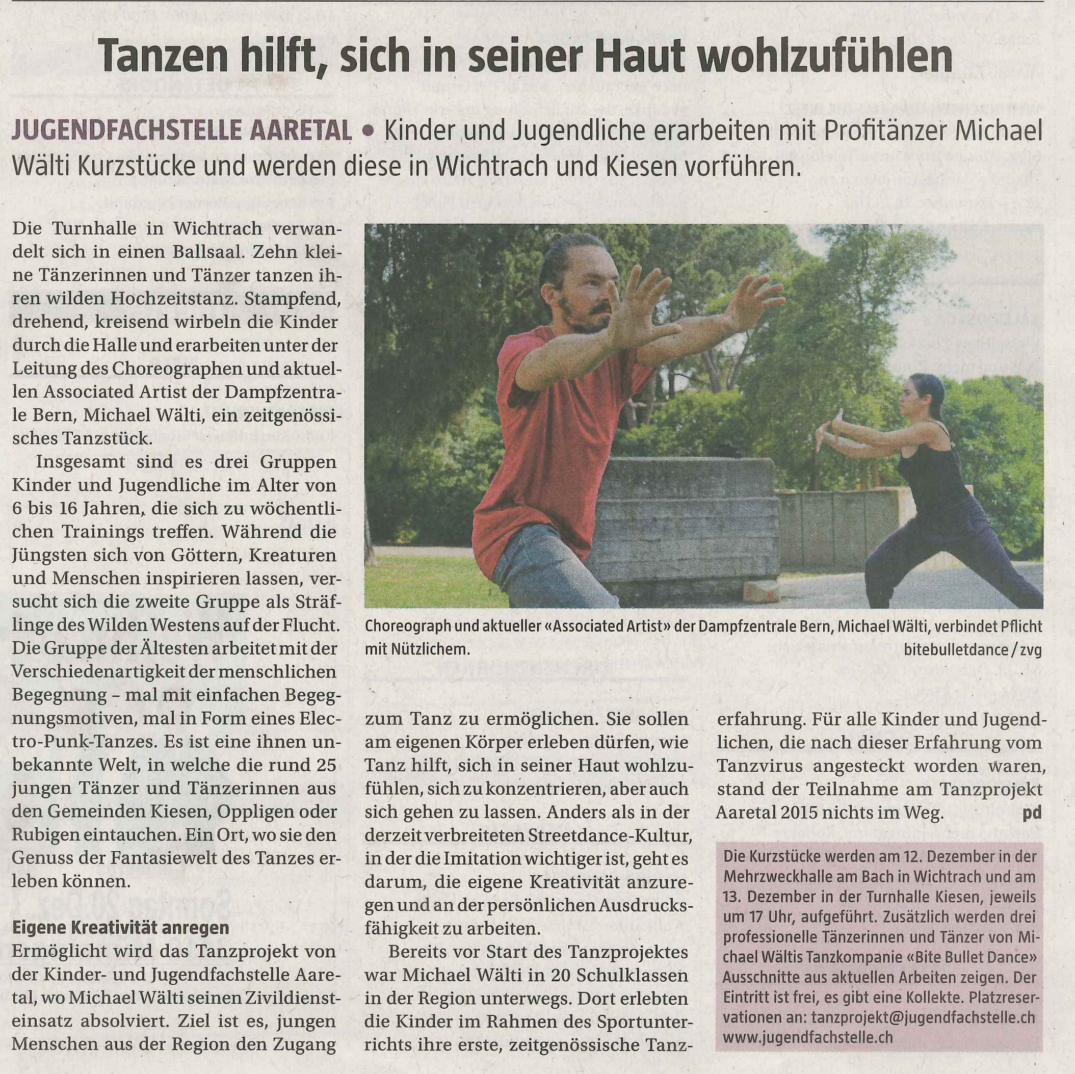 Das Tanzprojekt wurde in den Jahren 2015 bis 2019 fünfmal durchgeführt. Die Kinder- und Jugendfachstelle Aaretal (KJuFA) ermöglichte Kindern und Jugendlichen aus dem Aaretal zeitgenössischen Tanz auszuprobieren und am eigenen Körper zu erleben wie er wirkt. Neben Schnupper-Workshops an Schulen und wöchentlichen Tanztrainings gab es jeweils als Abschluss eine bunte und vielfältige Aufführung. Dieses Projekt war eine Zusammenarbeit mit dem berner Tänzer und Choreografen Michael Wälti.