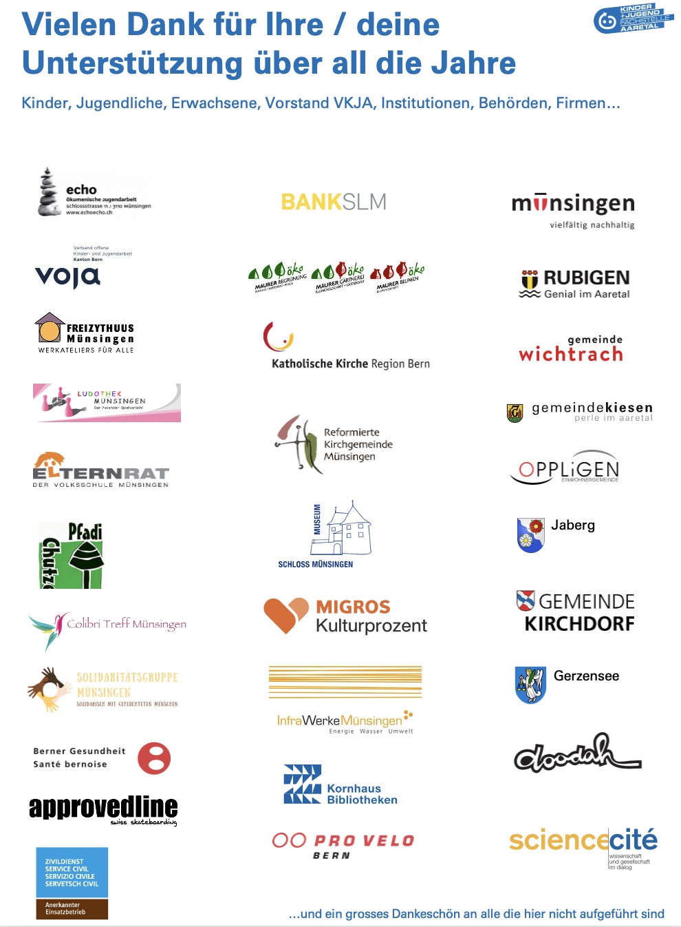 Der Verein Kinder- und Jugendarbeit Aaretal (VKJA) ist Träger der Kinder- und Jugendfachstelle Aaretal. Der Verein wurde 1984 gegründet und hat sich im 2015 neu organisiert. Mitglieder des Vereins sind im Wesentlichen die Einwohnergemeinde Münsingen und die Einwohnergemeinden der Region mit Zusammenarbeitsvertrag, namentlich Gerzensee, Jaberg, Kiesen, Kirchdorf, Oppligen, Rubigen und Wichtrach. Mit den beiden Kirchgemeinden Münsingen existiert eine Unterstützungsvereinbarung.